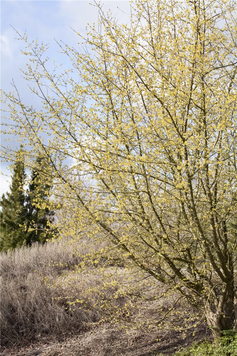 Cornus mas wächst buschig, aufrecht, breit und erreicht gewöhnlich eine Höhe von 3 - 4 m und wird bis zu 3 - 5 m breit.