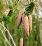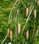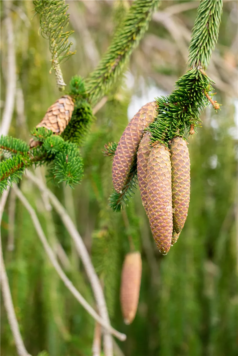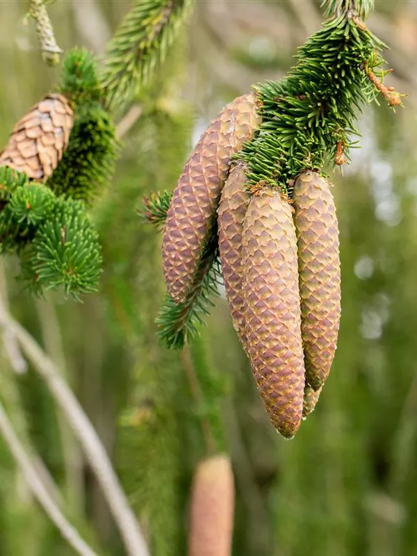 Die zylindrischen, braunen Zapfen von Picea abies 'Inversa' erscheinen ab September. Die jungen Zapfen haben eine purpurrote Färbung.
