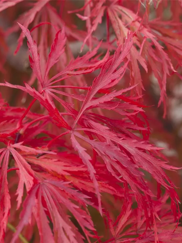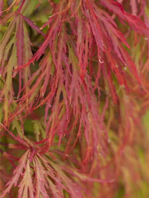 Hoher Blattschmuckwert. Die sommergrünen Blätter des Grünen Schlitzahorns 'Dissectum' sind hellgrün, tief geschlitzt, gegenständig. Diese sind etwa 6 - 11 cm groß. Grüner Schlitzahorn 'Dissectum' zeigt sich leuchtend orange-rot im Herbst.