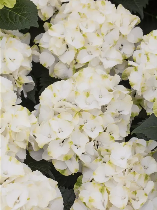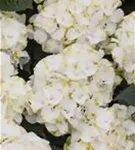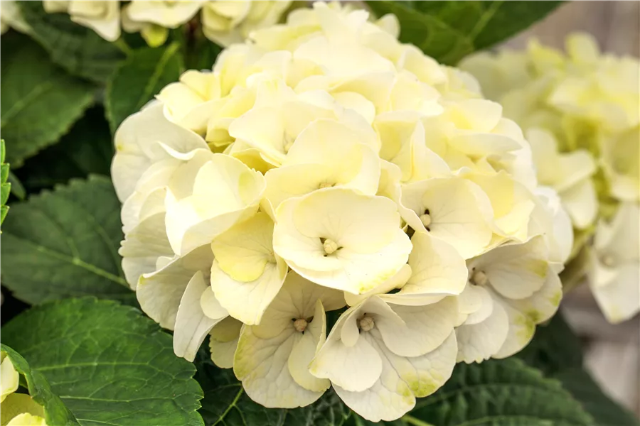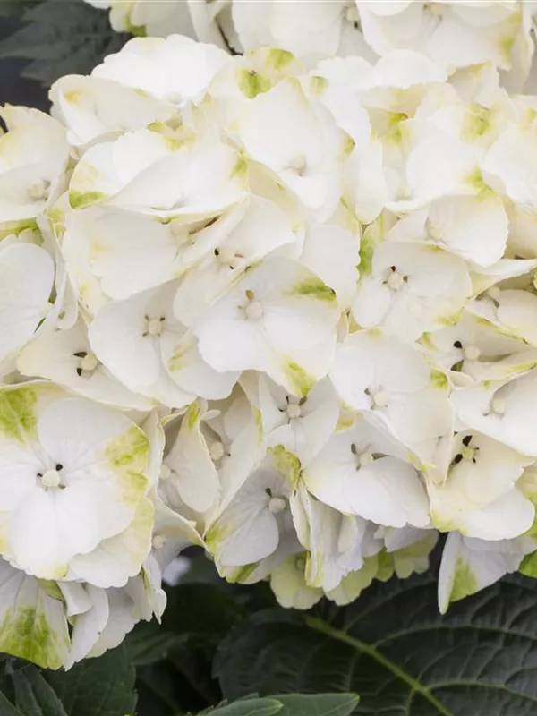 Die cremeweißen, schalenförmigen Blüten der Bauernhortensie 'Caipirinha' erscheinen in Dolden von Juni bis September.