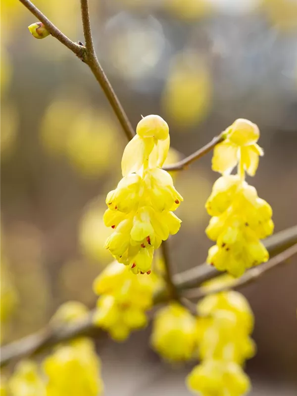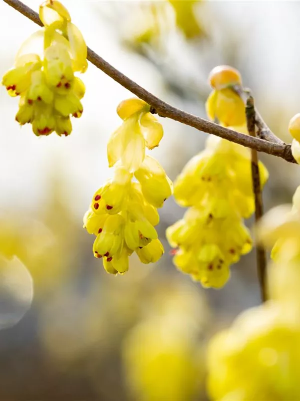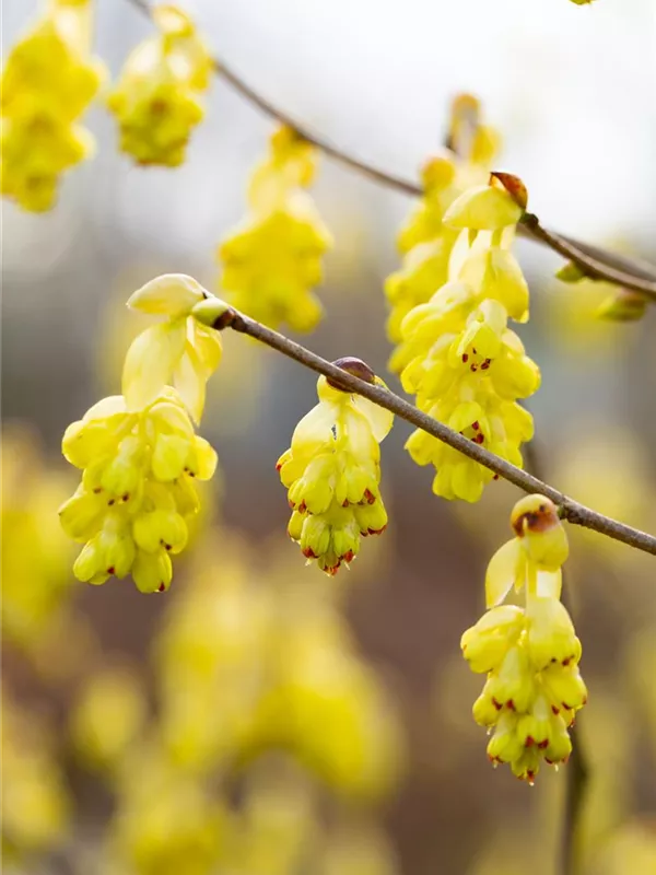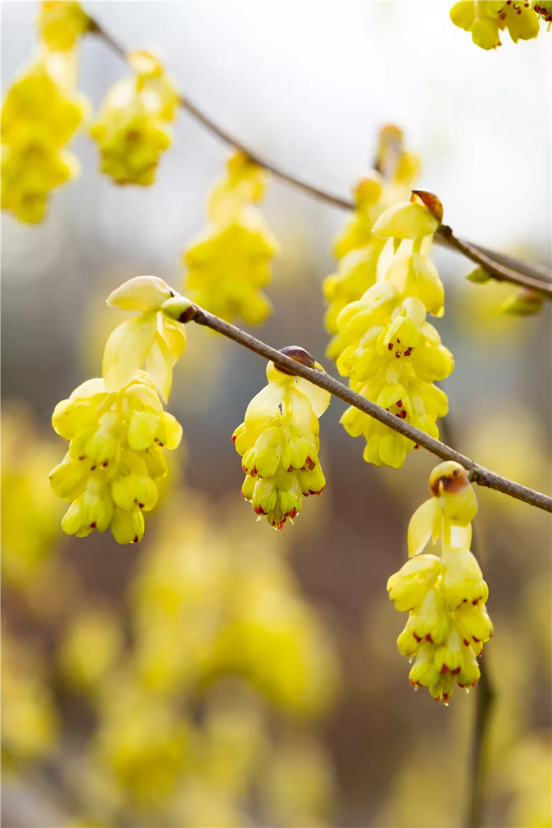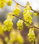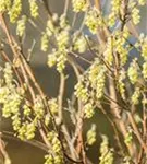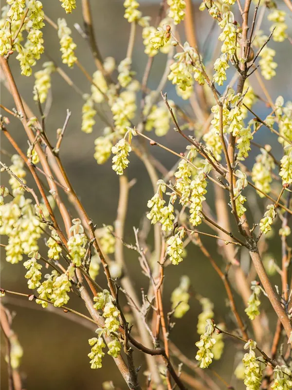 Die hellgelben Blüten der Chinesischen Scheinhasel 'Spring Purple' erscheinen in Trauben im April. Diese sind angenehm duftend.