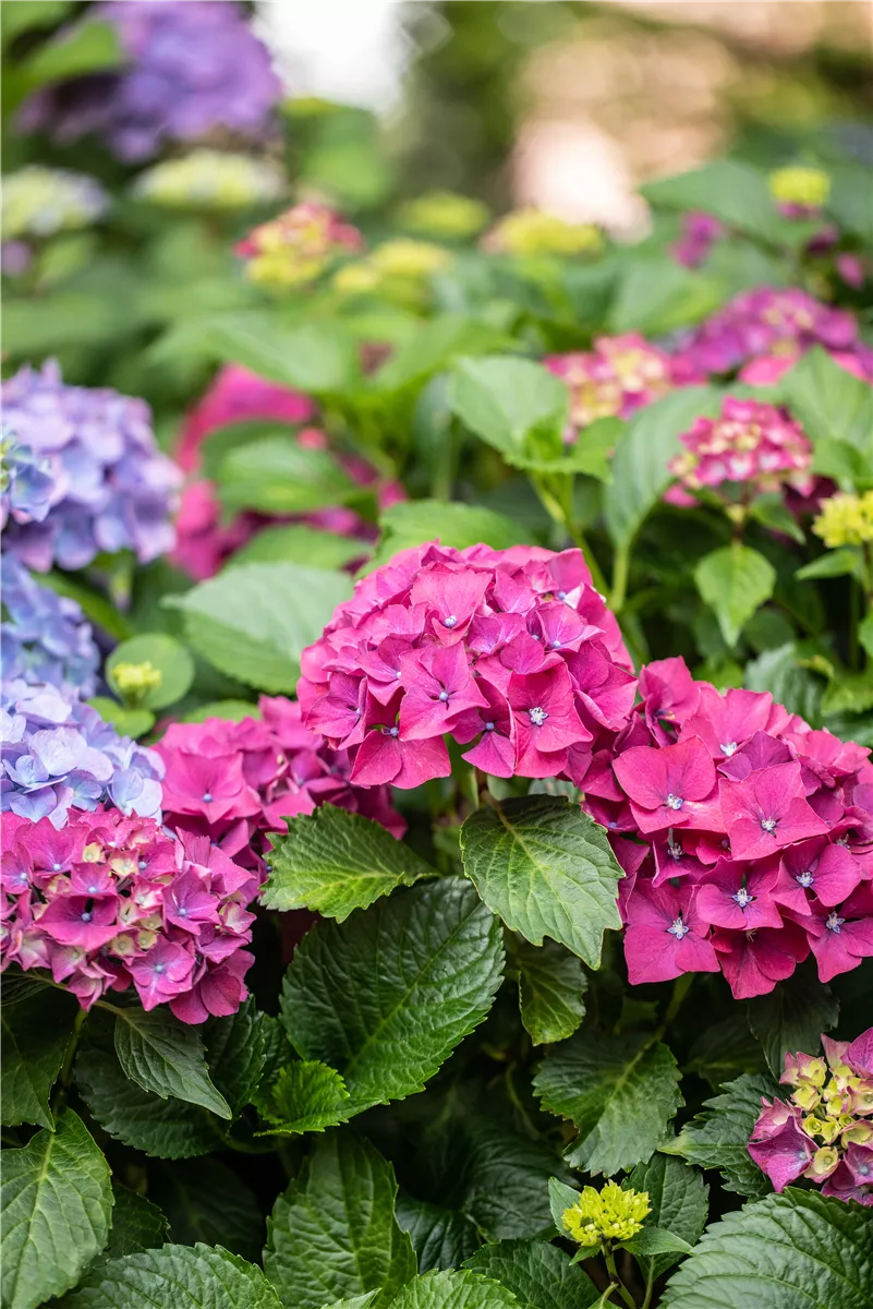 Bauernhortensie 'Forever & Ever'®, rot ist ein buschig und rundlich wachsender Kleinstrauch. Sie erreicht gewöhnlich eine Höhe von 70 - 90 cm und wird ca. 70 - 90 cm breit.