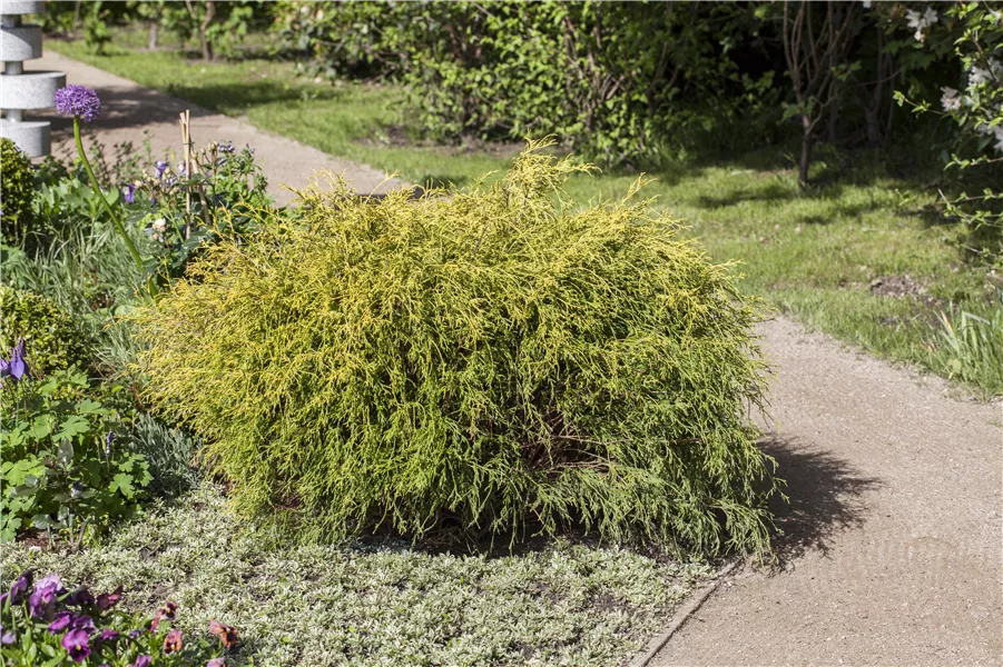 Sehr dekorativ. Die Gelbe Fadenzypresse 'Filifera Aurea Nana' ist immergrün. Ihre Nadeln sind goldgelb, weich, schuppenförmig.