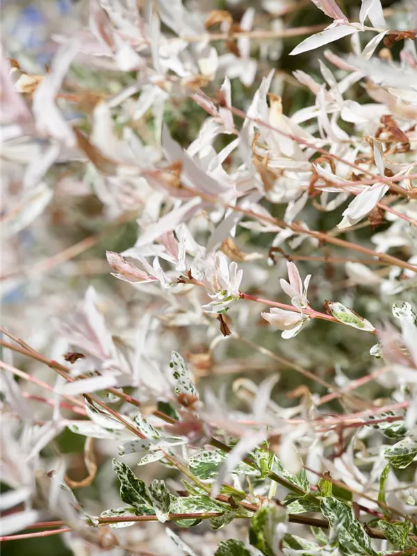 Ihre Blätter sind grün-weiß. Rosa im Austrieb.