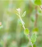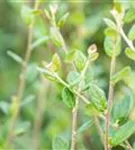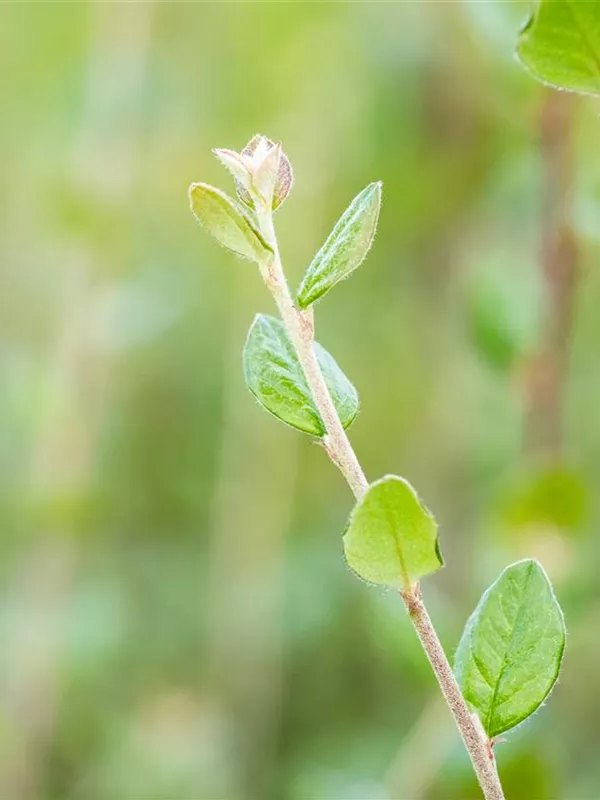 Die sommergrünen Blätter der Graue Strauchmispel sind dunkelgrün, eiförmig, glänzend, wechselständig. Diese sind etwa 1 - 2 cm groß. Graue Strauchmispel zeigt sich leuchtend rot-braun bis gelb im Herbst. Lange haftend.