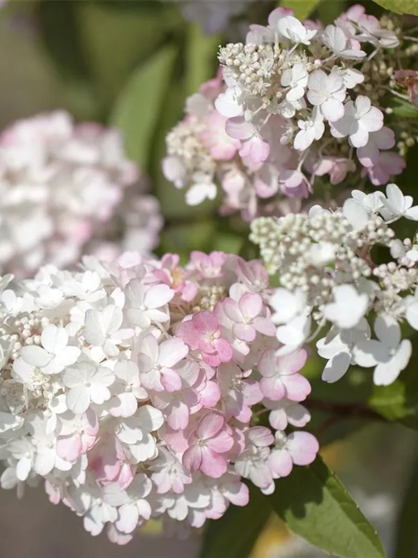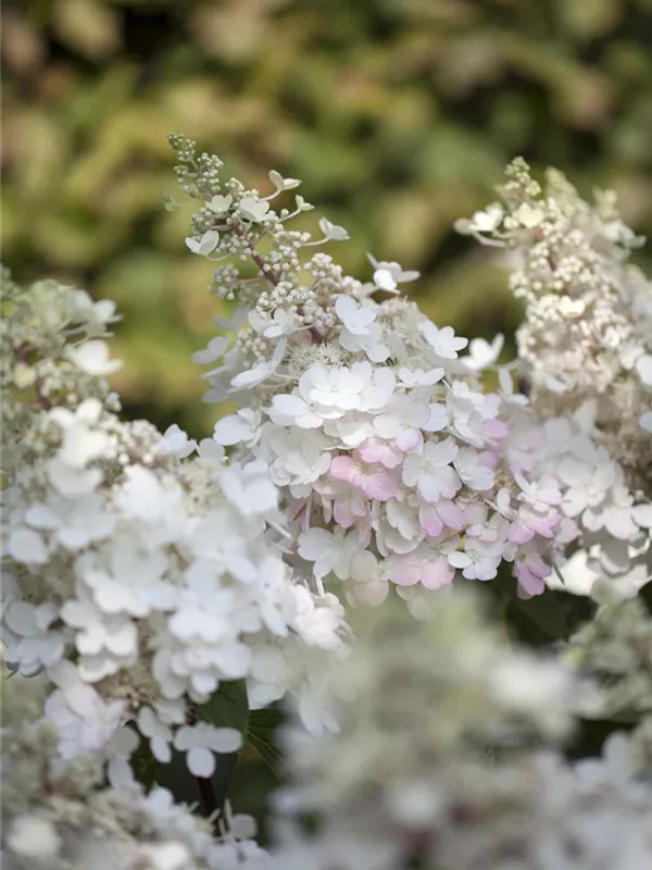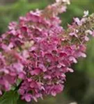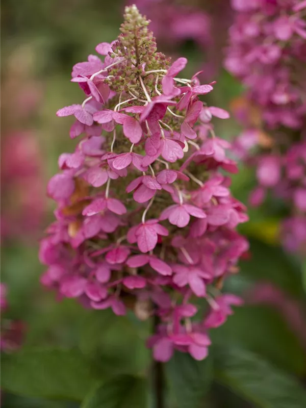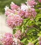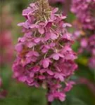 Die Rispenhortensie 'Pinky Winky'® (Hydrangea paniculata 'Pinky Winky'®) bildet weiße, später rosa, duftende Blüten von Juli bis September.Anordnung der Blüten in schönen Rispen.