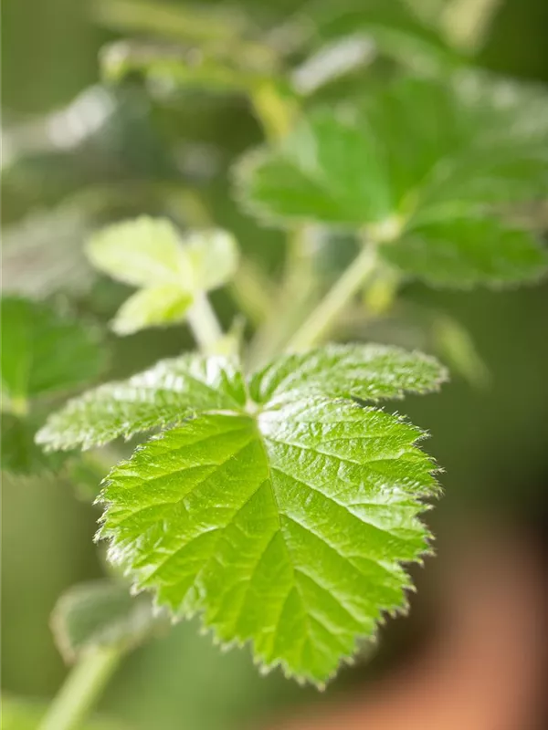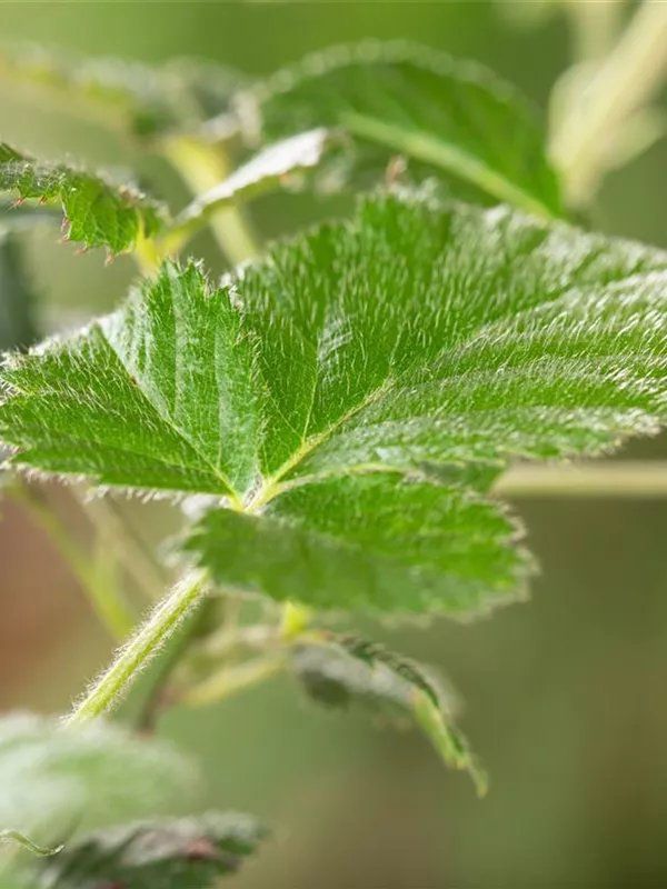 Die sommergrünen Blätter der Brombeere 'Loch Ness'(s) sind dunkelgrün, gefiedert, wechselständig. Brombeere 'Loch Ness'(s) zeigt sich leuchtend rot-braun im Herbst. Lange haftend.