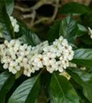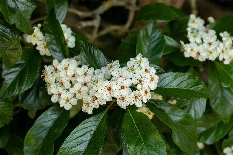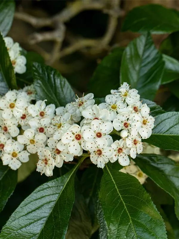 Die weißen Blüten des Pflaumenblättrigen Weißdorn erscheinen in Schirmtrauben von Mai bis Juni.