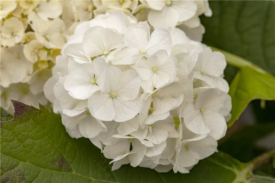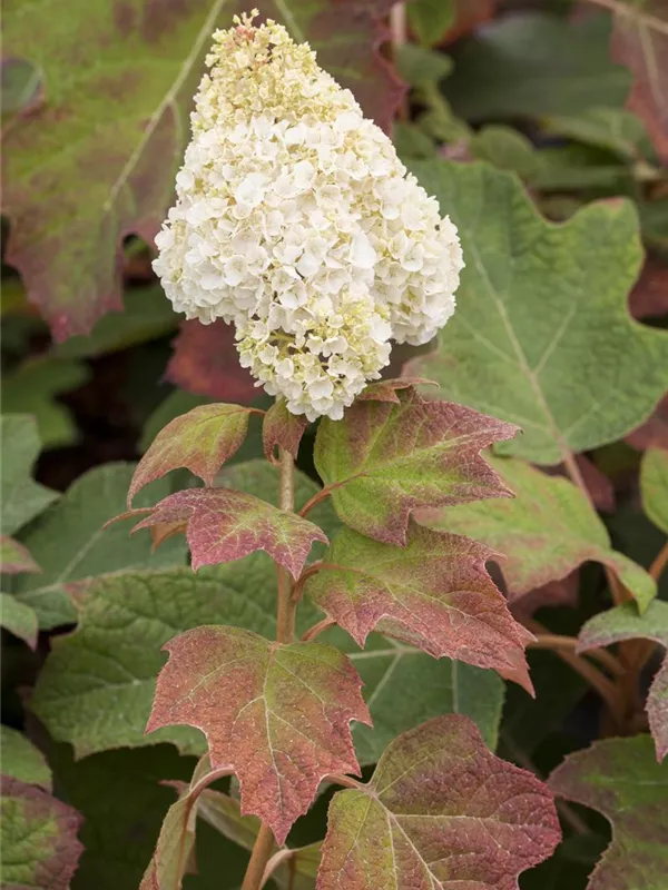 Die weißen Blüten der Eichenblättrigen Hortensie 'Harmony' erscheinen in Rispen von Juni bis August. Diese werden etwa 10 - 20 cm groß und sind leicht duftend.