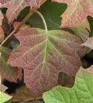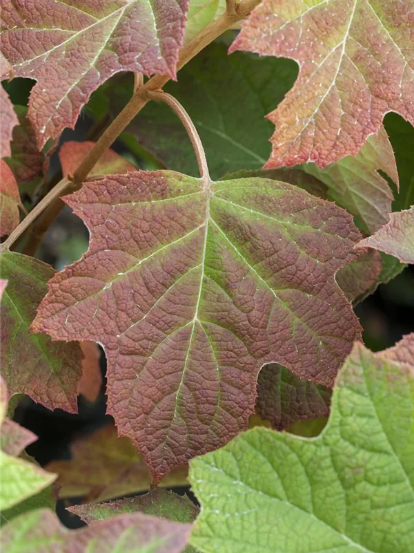 Die sommergrünen Blätter der Eichenblättrige Hortensie 'Harmony' sind dunkelgrün, eiförmig, gegenständig, gelappt. Eichenblättrige Hortensie 'Harmony' zeigt sich leuchtend dunkelrot im Herbst.