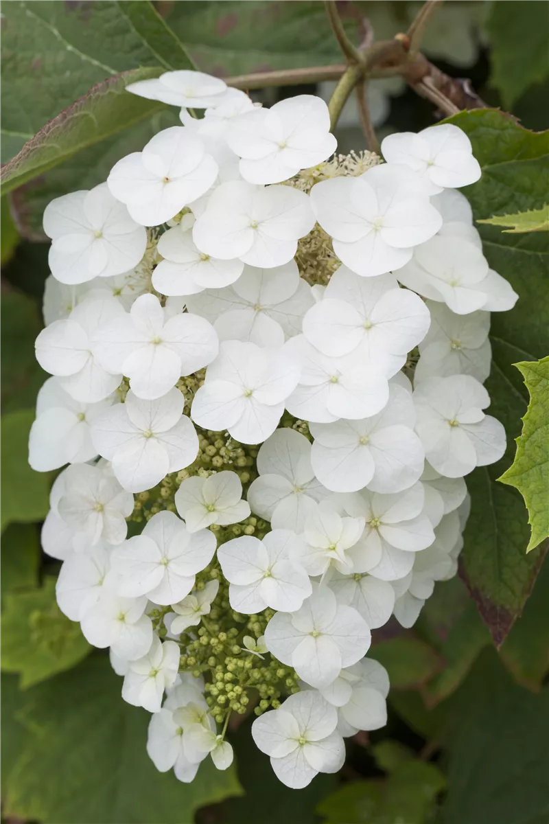 Die weißen Blüten der Eichenblättrigen Hortensie 'Snowflake' erscheinen in Rispen von Juni bis August. Diese werden etwa 10 - 20 cm groß und sind leicht duftend.