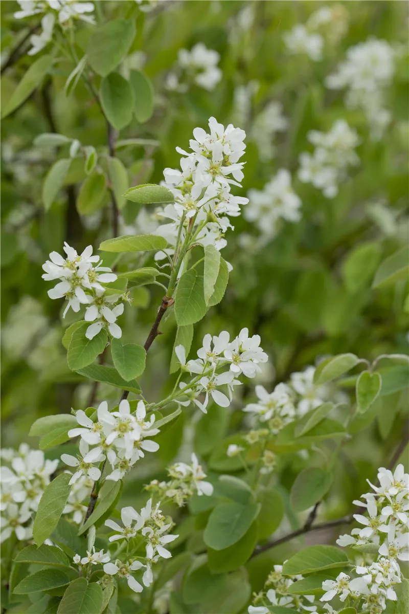 Die cremeweißen Blüten der Felsenbirne 'Honeywood' erscheinen in Trauben von Ende April bis Anfang Mai.