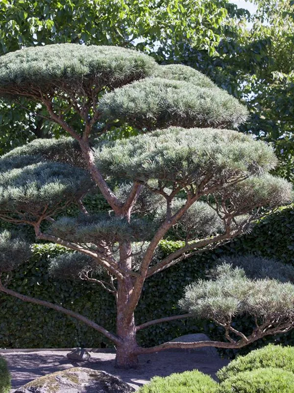 Wald-Kiefer 'Glauca' ist ein kegelförmig und breit wachsender Kleinbaum. Sie erreicht gewöhnlich eine Höhe von 10 - 15 m und wird ca. 5 - 8 m breit. In der Regel wächst sie 20 - 25 cm pro Jahr.
