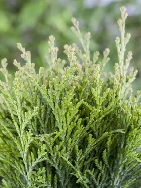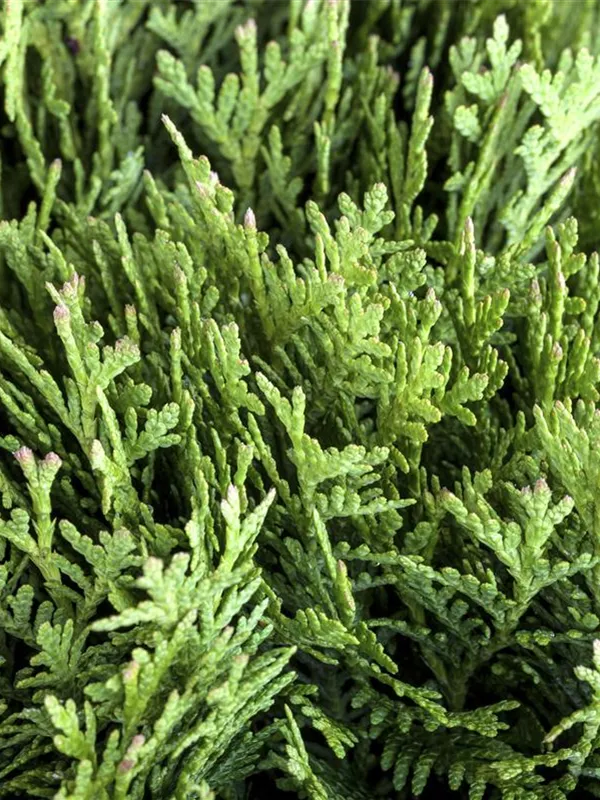 Die Zapfen von Thuja occidentalis 'Danica' erscheinen ab Oktober. Die jungen Zapfen haben eine grüngelbe Färbung.