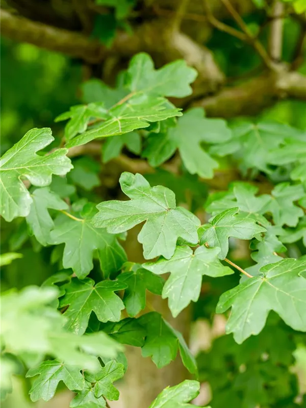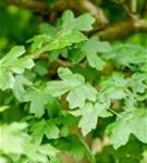 Die sommergrünen Blätter des Kugel-Feldahorns 'Nanum' sind dunkelgrün, gegenständig, gelappt. Diese sind etwa 5 - 10 cm groß. Kugel-Feldahorn 'Nanum' zeigt sich leuchtend orangegelb im Herbst.