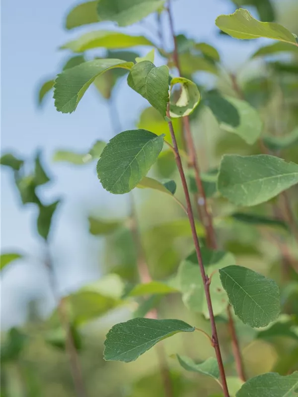 Die sommergrünen Blätter der Felsenbirne 'Obelisk'® sind mittelgrün, eiförmig. Kupferbrauner Austrieb. Felsenbirne 'Obelisk'® zeigt sich leuchtend gelb-rot im Herbst.
