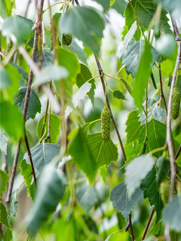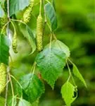 Die grüngelben Blüten der Trauerbirke 'Youngii' erscheinen in Kätzchen von März bis April. Diese werden etwa 5 cm groß.