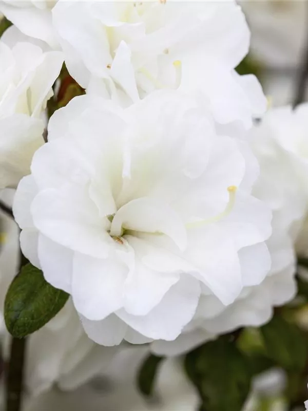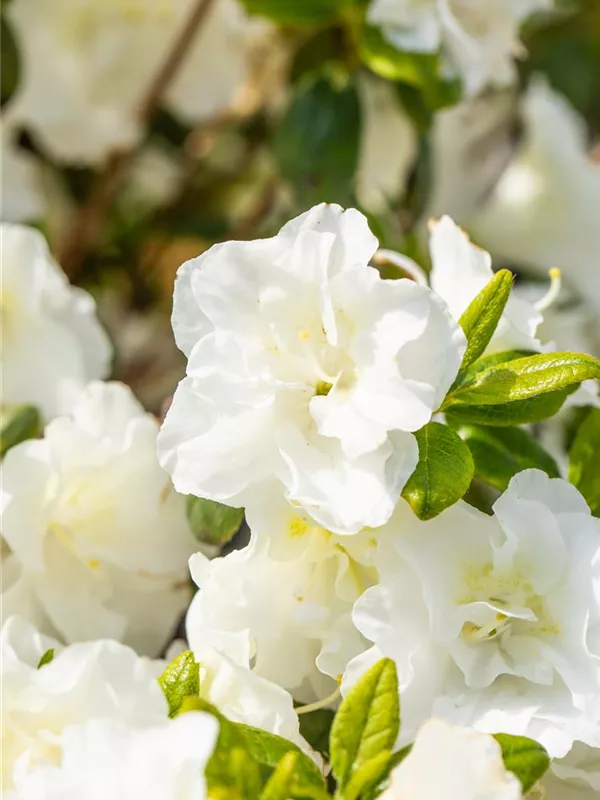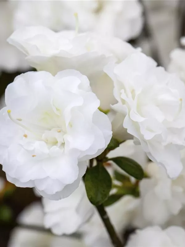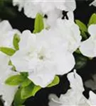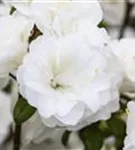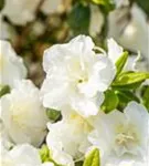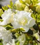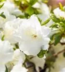 Rhododendron obtusum 'Schneeperle'® bildet von Mitte Mai bis Mitte Juni zahlreiche halbgefüllte, trichterförmige, weiße Blüten. Diese werden etwa 2 - 3 cm groß.
