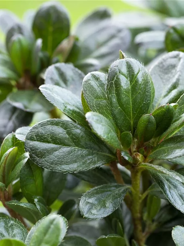 Die Japanische Azalee 'Canzonetta' ist wintergrün und trägt dunkelgrüne, glänzende, eiförmige Blätter.