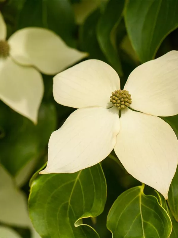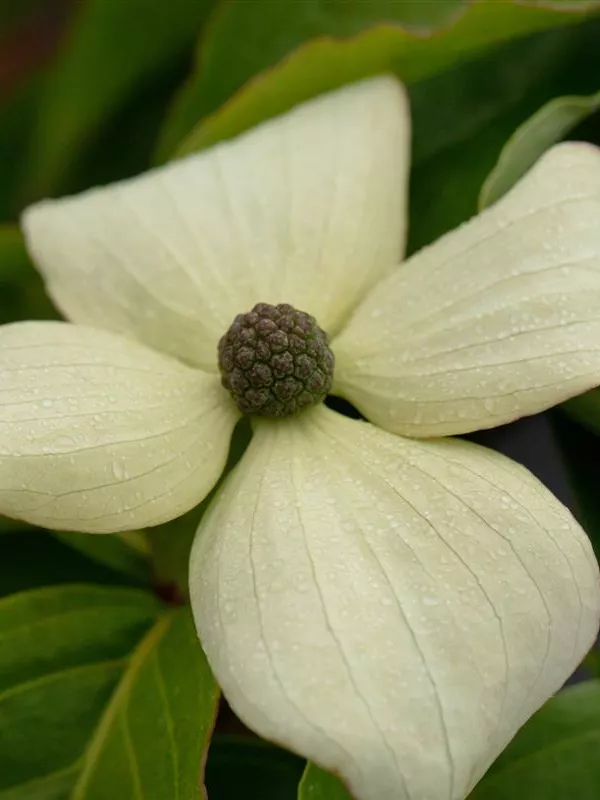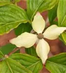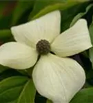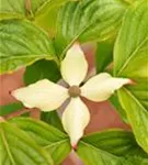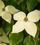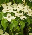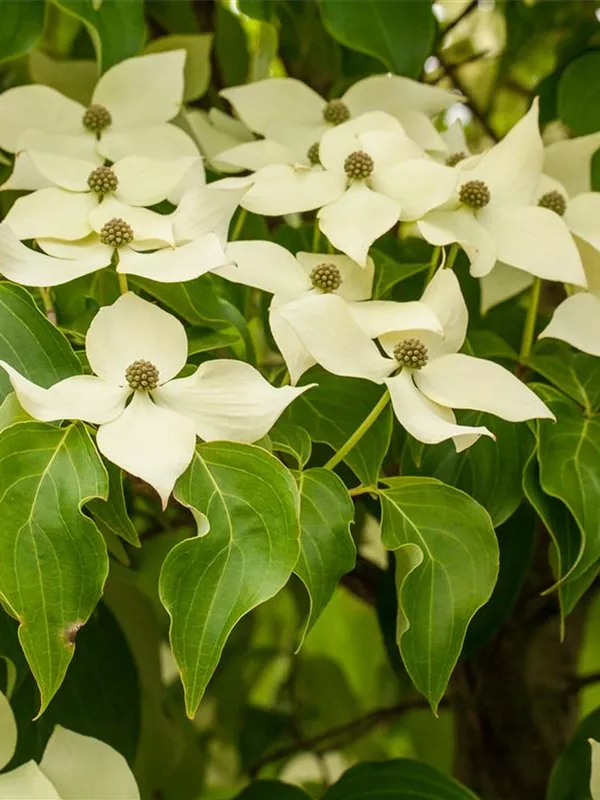 Die weißen Blüten der Japanischen Blumen-Hartriegel 'Claudia' erscheinen in Dolden von Juni bis Juli. Diese werden etwa 6 - 8 cm groß.