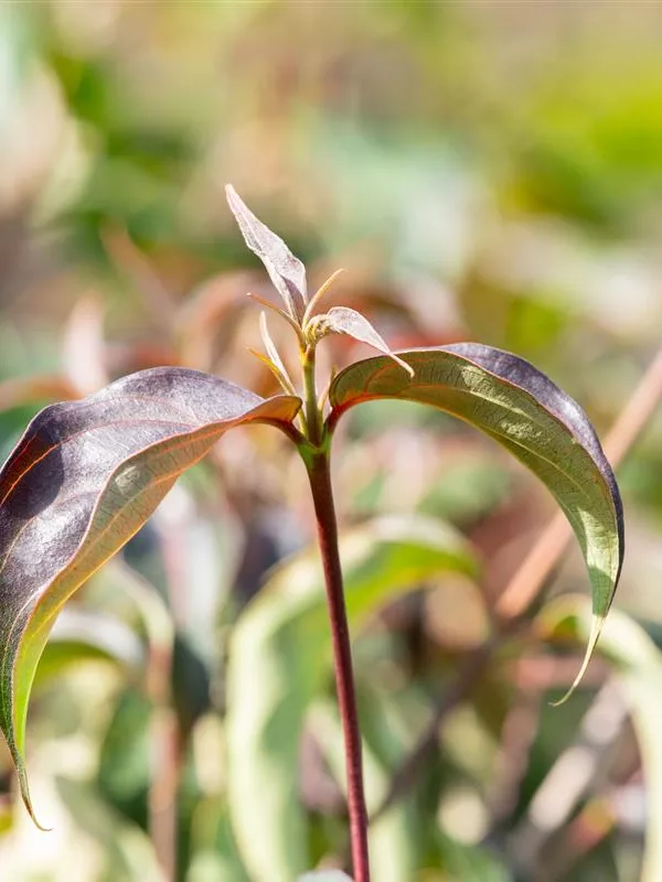 Die sommergrünen Blätter des Japanischen Blumen-Hartriegels 'Cappuccino'® sind dunkelgrün, eiförmig, gegenständig, gewellt. Diese sind etwa 8 - 9 cm groß. Bordeauxroter Austrieb. Japanischer Blumen-Hartriegel 'Cappuccino'® zeigt sich leuchtend scharlachrot im Herbst.