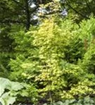 Seine geschnitten Blätter sind gelb-grün. Im Herbst verfärben sie sich prächtig gelb. Orange im Austrieb.