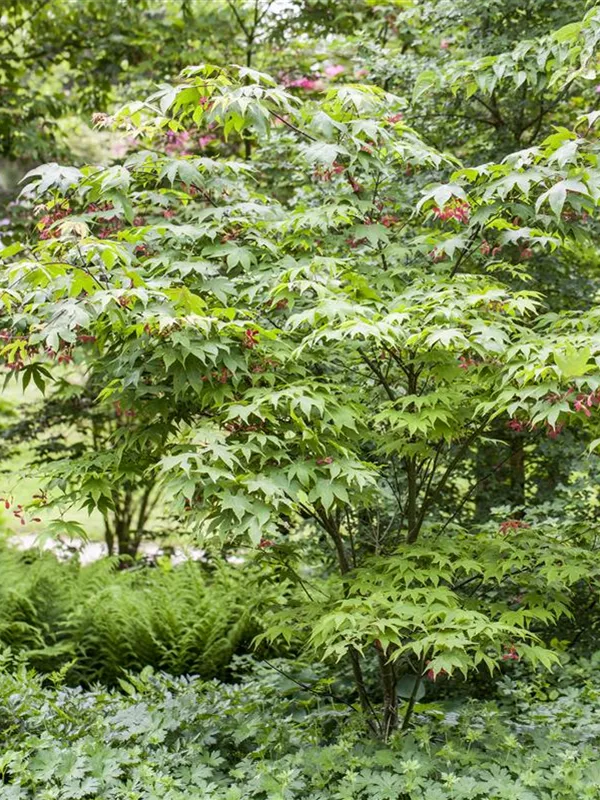 Die purpurroten Blüten des Fächerahorn 'Osakazuki' erscheinen in Trauben im Mai.