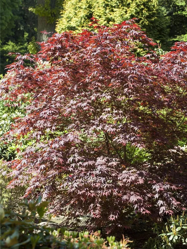 Fächerahorn 'Bloodgood' ist ein breit, rundlich wachsender, malerischer Großstrauch. Er erreicht gewöhnlich eine Höhe von 4 - 6 m und wird ca. 4 - 6 m breit. In der Regel wächst er 10 - 20 cm pro Jahr.