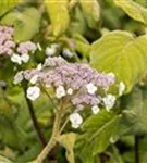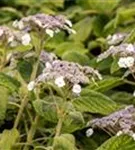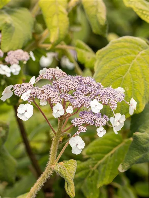 Die violetten Blüten der Samt-Hortensie erscheinen in Rispen von Ende Juli bis Mitte September. Diese werden etwa 15 - 30 cm groß.