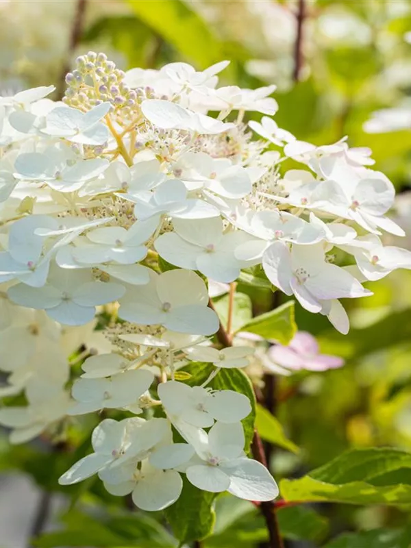 Die weißen, später rosafarbenen Blüten der Rispenhortensie 'Unique' erscheinen in Rispen von August bis September. Diese sind angenehm duftend.