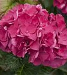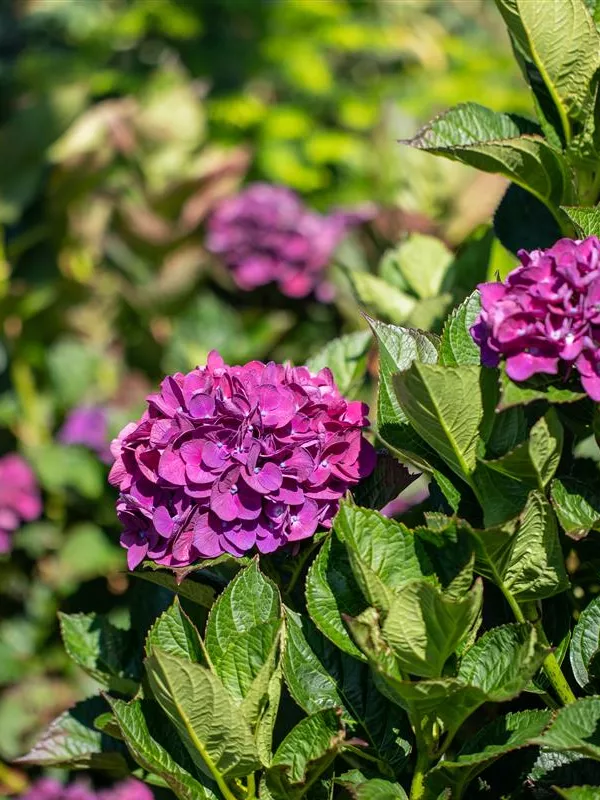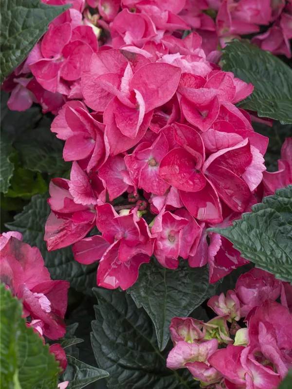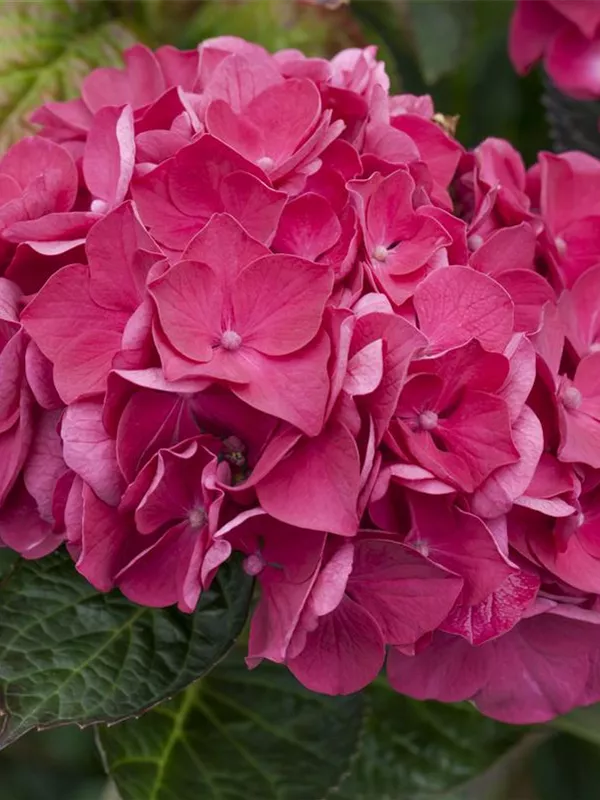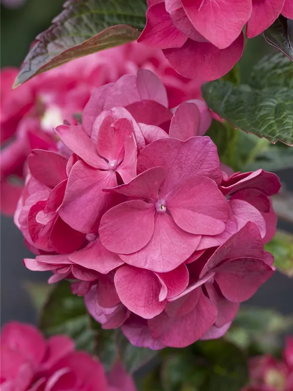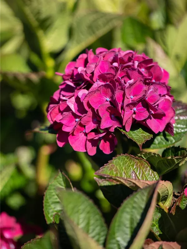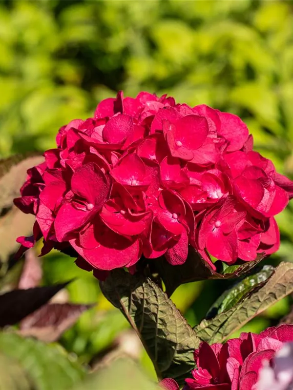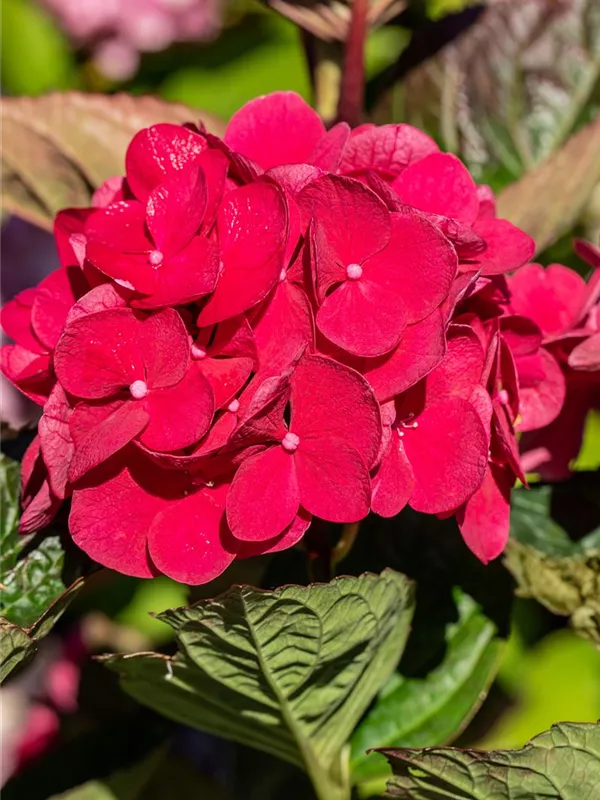 Die purpurroten, schalenförmigen Blüten der Bauernhortensie 'Merveille Sanguine' erscheinen in Dolden von Juni bis September.