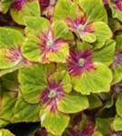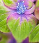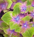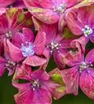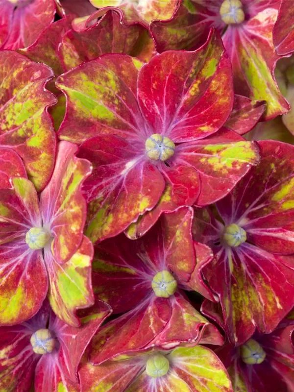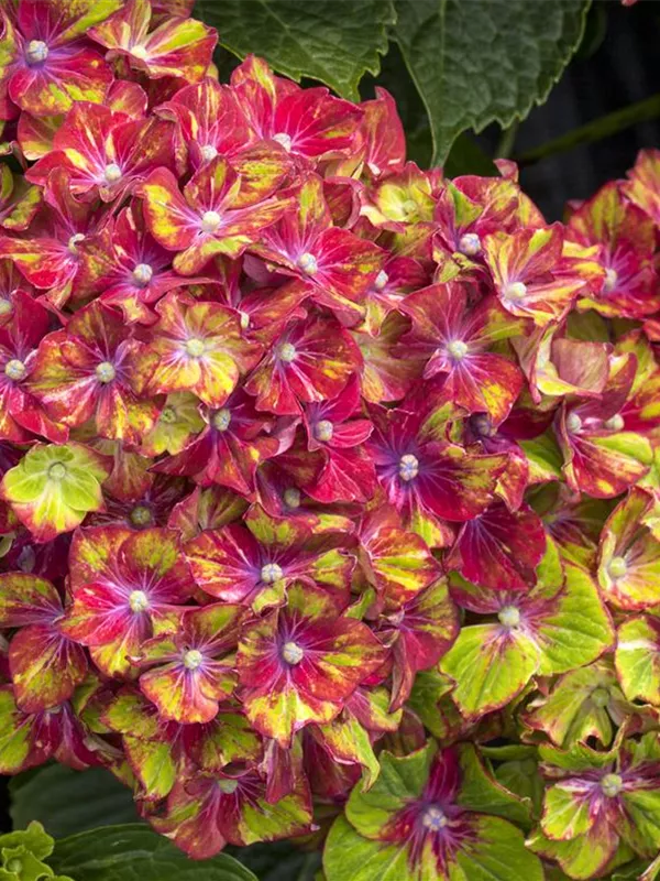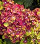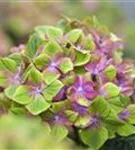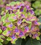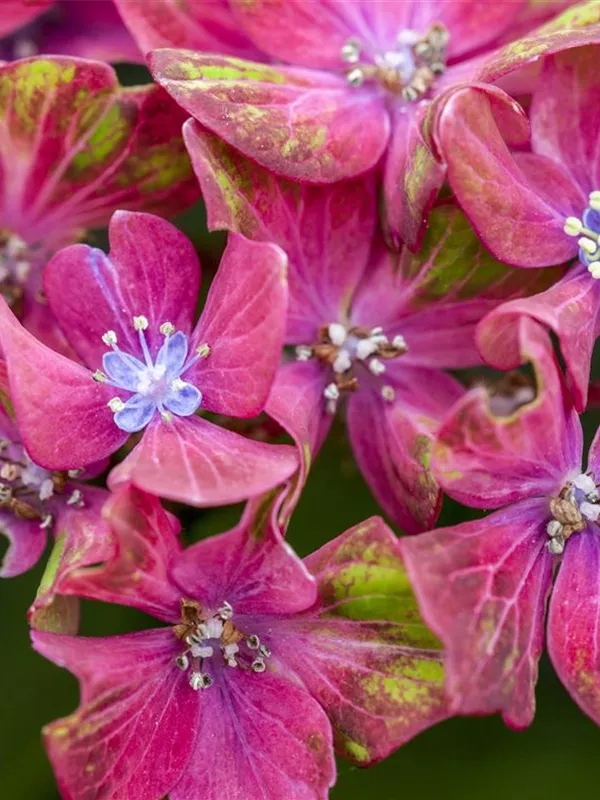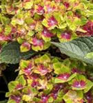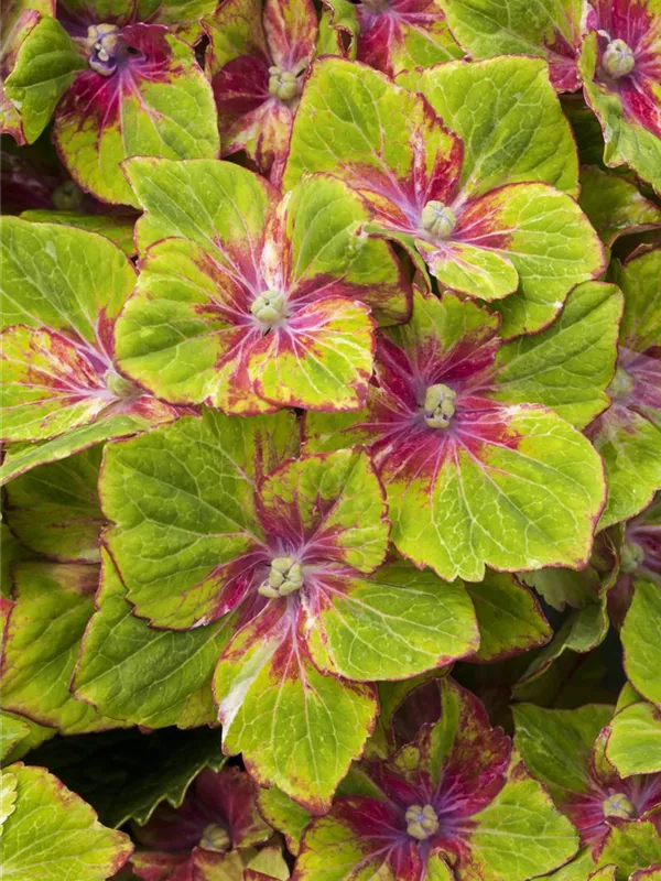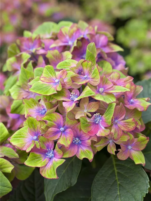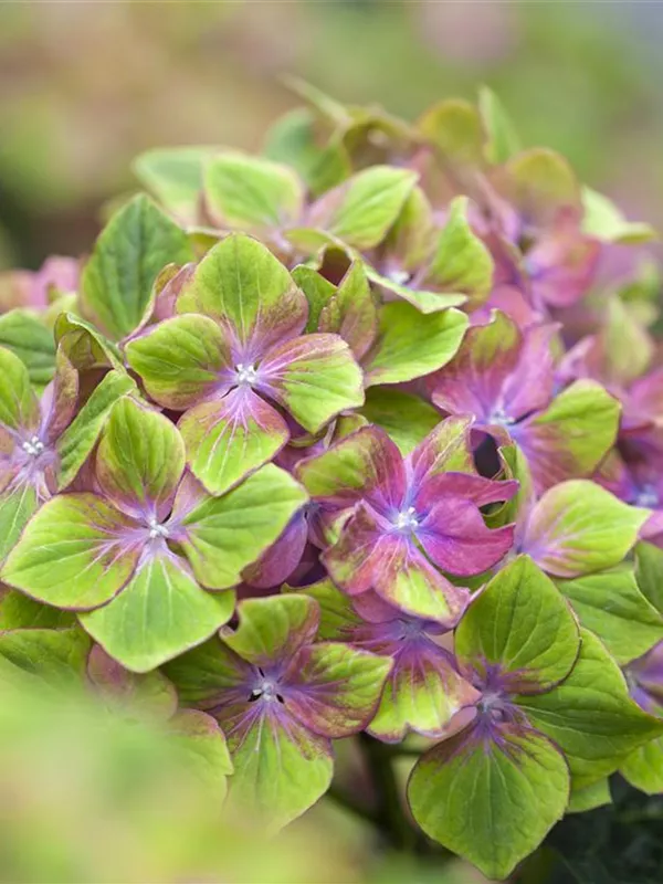 Die mehrfarbigen, schalenförmigen Blüten der Bauernhortensie 'Saxon® Schloss Wackerbarth, Horwack(s)' erscheinen in Dolden von Juni bis September.