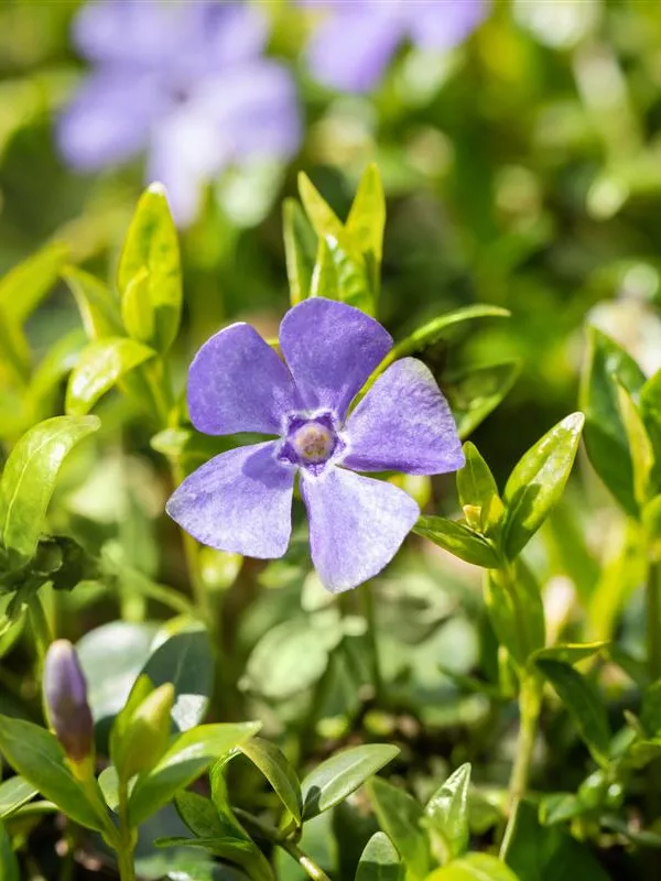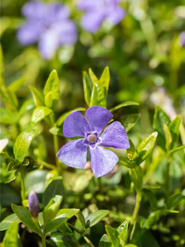 Vinca minor 'Marie'(s) bringt von April bis Mai blaue, violette, radförmige Blüten hervor.