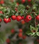 Besonders dekorativ sind die roten, runden Früchte von Cotoneaster praecox. Diese erscheinen ab August und sind groß.