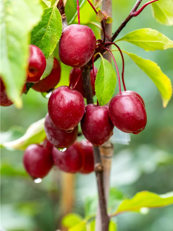 Besonders dekorativ sind die roten, runden Früchte von Malus 'Red Obelisk'. Diese erscheinen ab September.