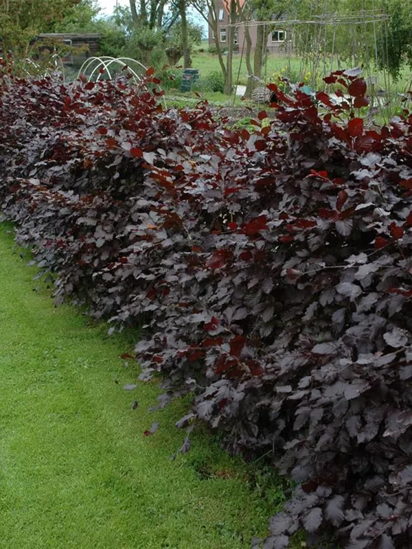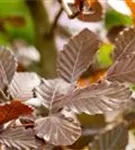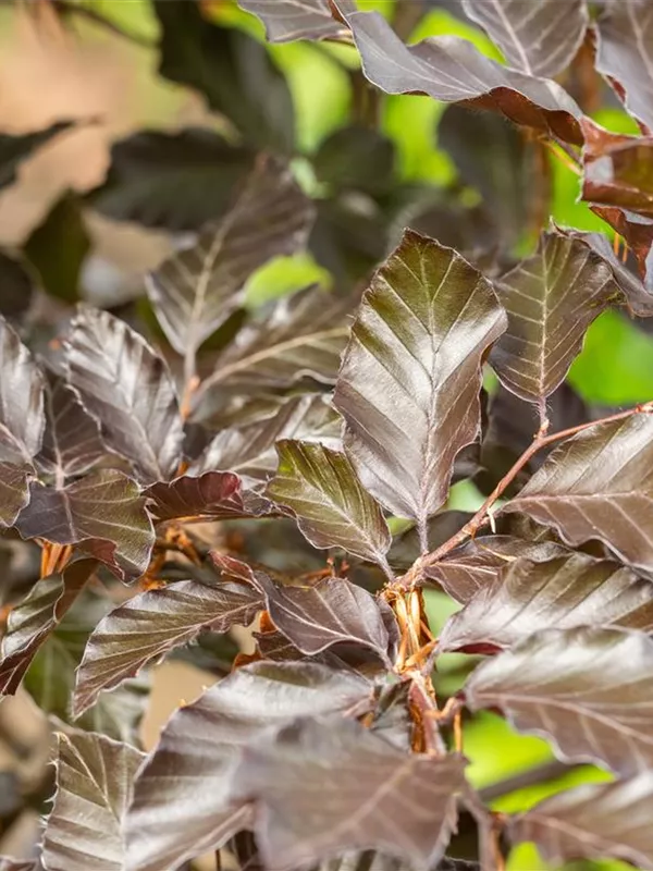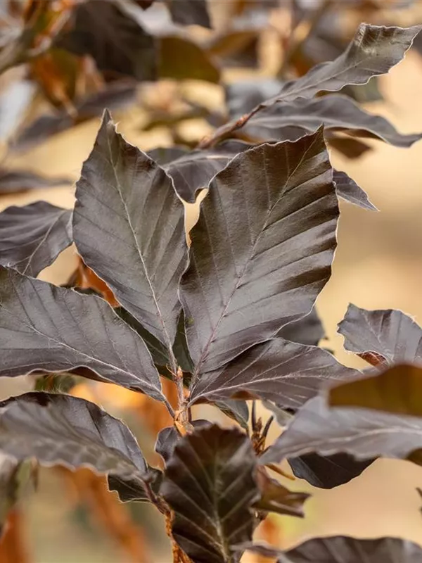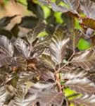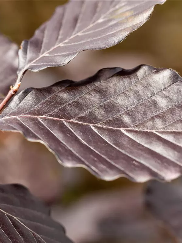 Hoher Blattschmuckwert. Die sommergrünen Blätter der Blutbuche sind schwarz-rot, eiförmig, wechselständig, gewellt. Diese sind etwa 5 - 10 cm groß. Dunkelroter Austrieb. Blutbuche zeigt sich leuchtend rot-braun im Herbst.