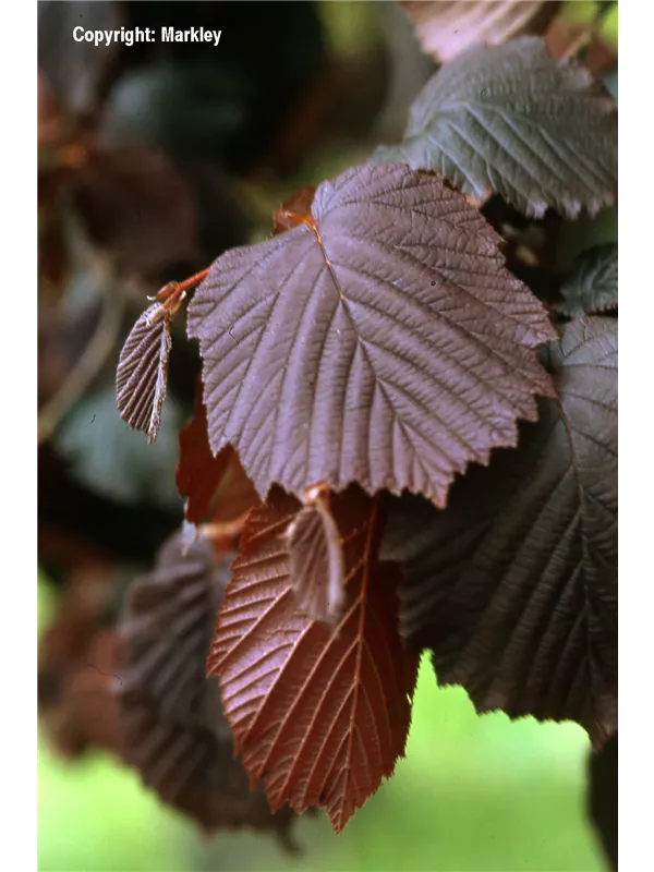 Hoher Blattschmuckwert. Die sommergrünen Blätter der Bluthasel 'Purpurea' sind schwarz-rot, rundlich, wechselständig, gesägt. Roter Austrieb.