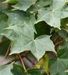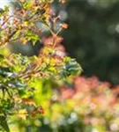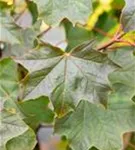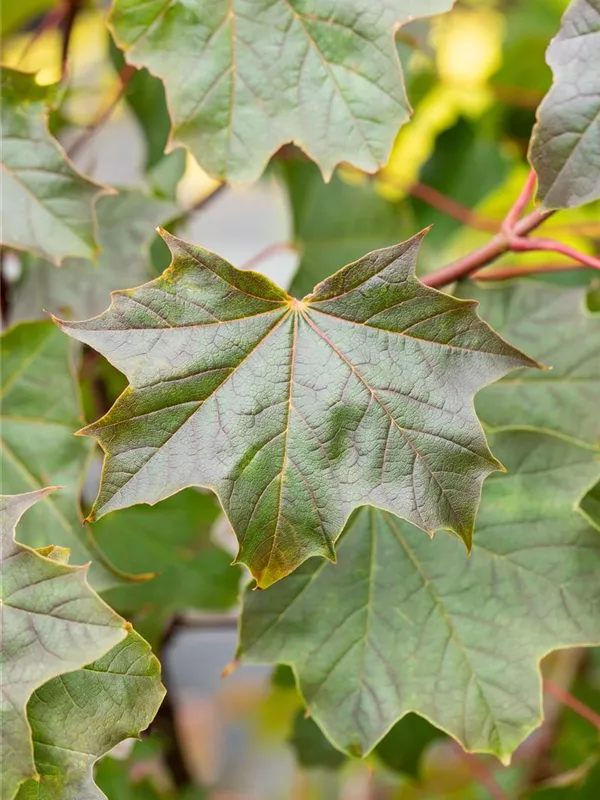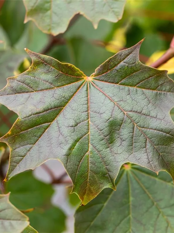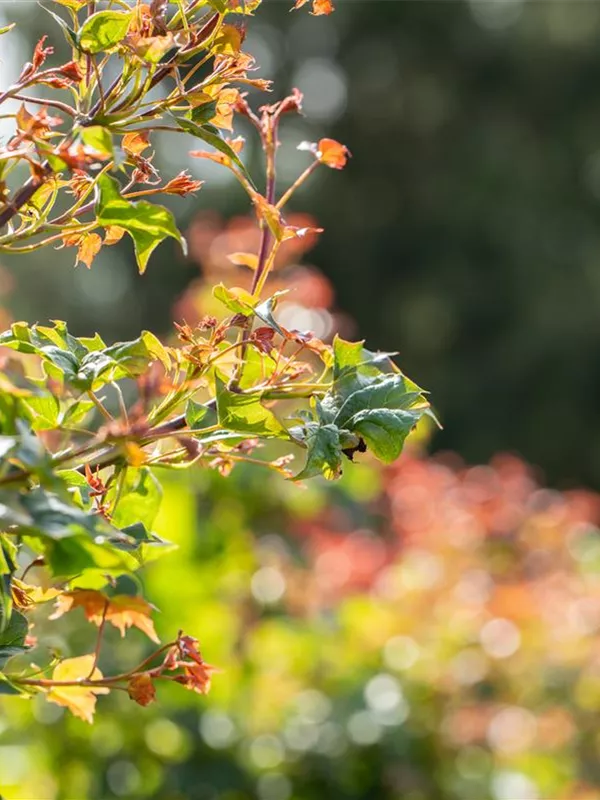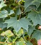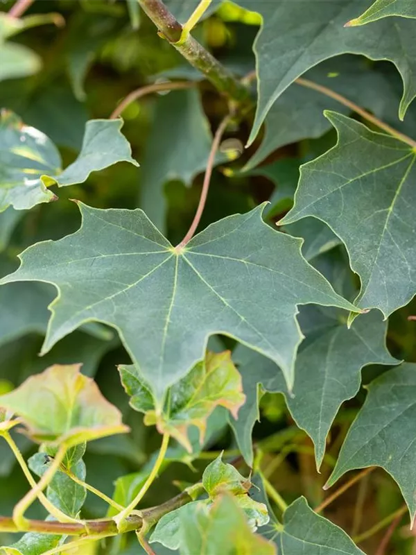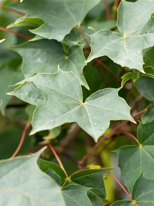 Die sommergrünen Blätter des Ahorns 'Ample Surprise' sind grün-rot, gedreht.