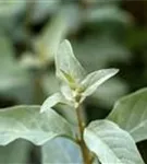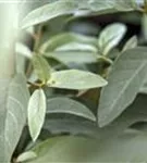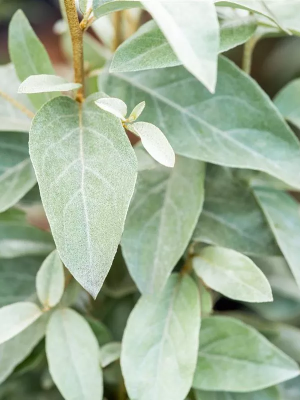 Die sommergrünen Blätter der Silberölweide 'Zempin' sind silbrig, eiförmig, lanzettlich, wechselständig. Diese sind etwa 8 - 10 cm groß.