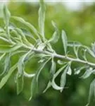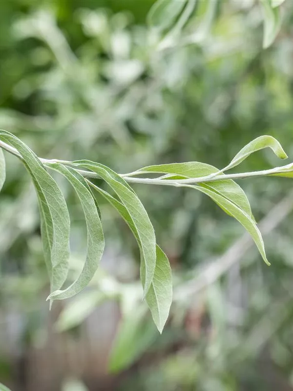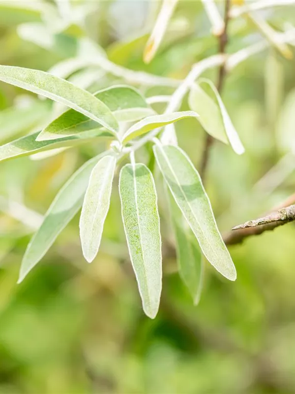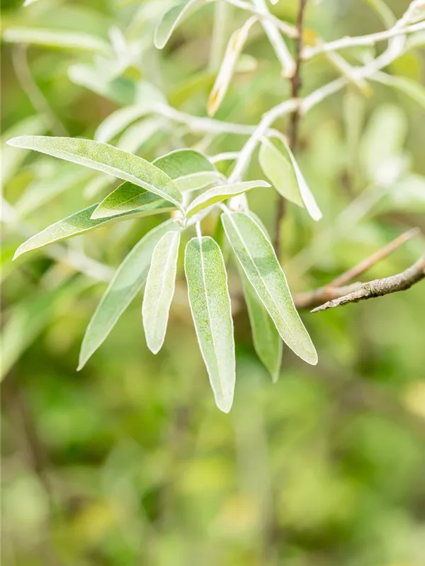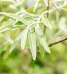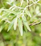 Hoher Blattschmuckwert. Die sommergrünen Blätter der Schmalblättrige Ölweide sind silbrig, lanzettlich, wechselständig. Diese sind etwa 4 - 8 cm groß. Weißer Austrieb.