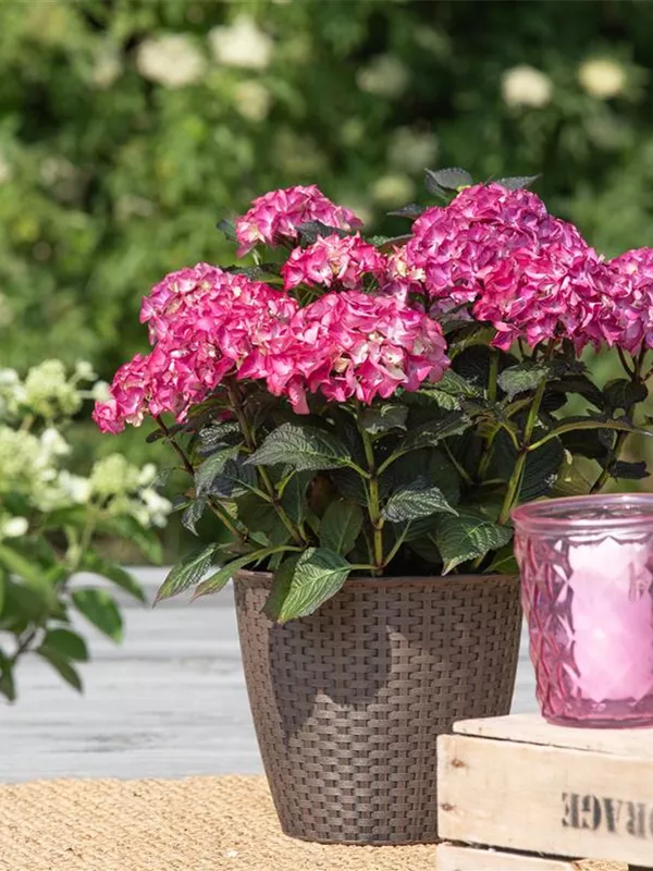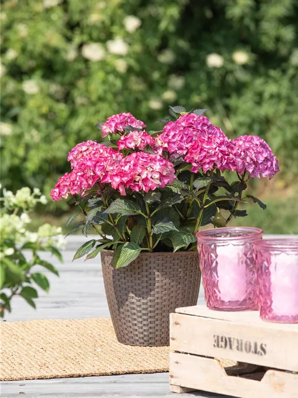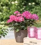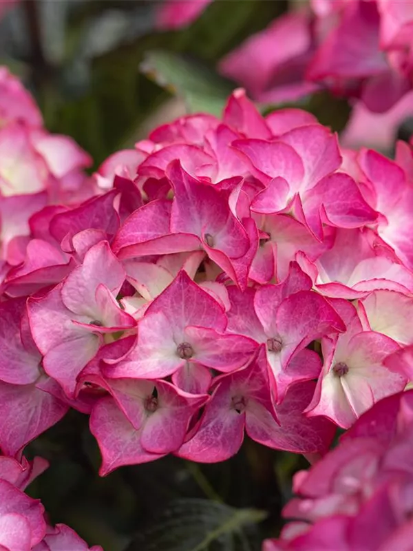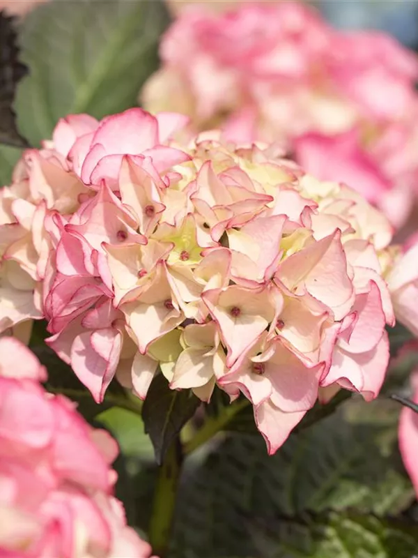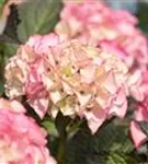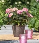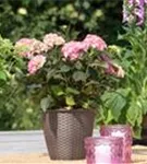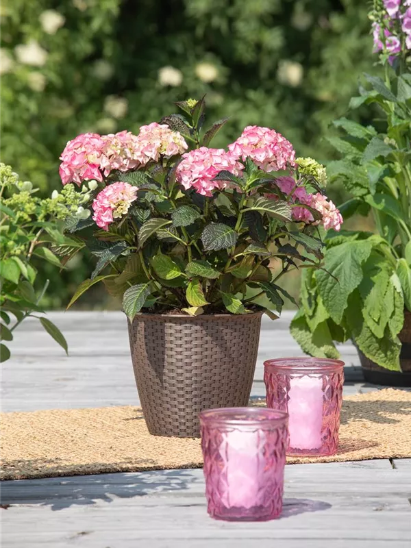 Die rosafarbenen, schalenförmigen Blüten der Gartenhortensie 'Black Diamonds'® erscheinen in Dolden von Juni bis September.