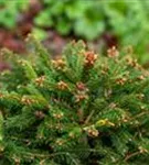 Die zylindrischen, braunen Zapfen von Picea abies 'Ohlendorffii' erscheinen ab September. Die jungen Zapfen haben eine purpurrote Färbung.