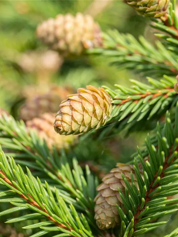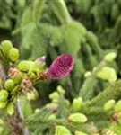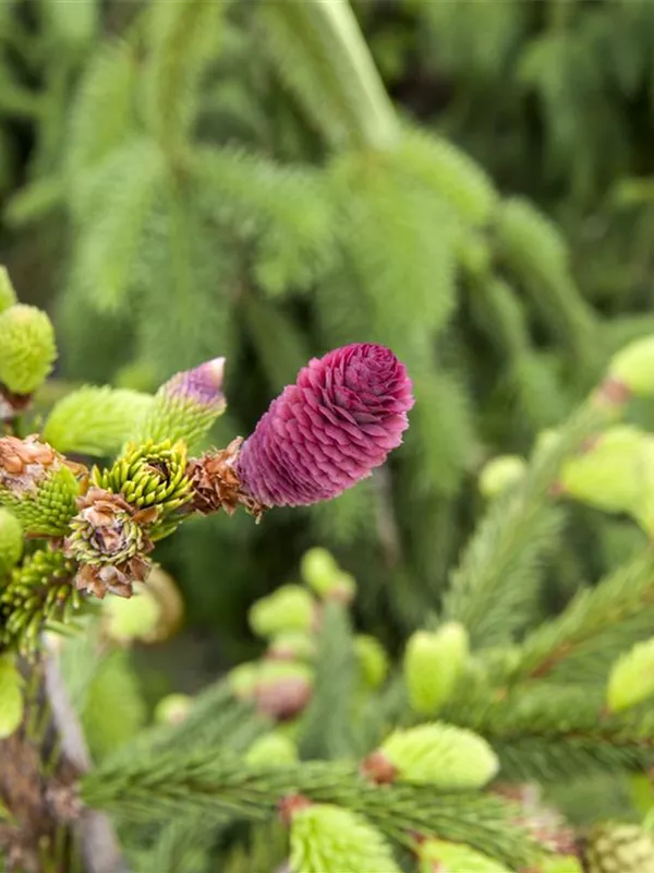 Die Zapfen von Picea abies 'Pusch' erscheinen ab September. Die jungen Zapfen haben eine purpurrote Färbung.