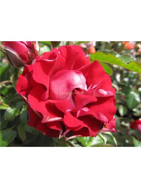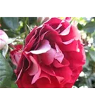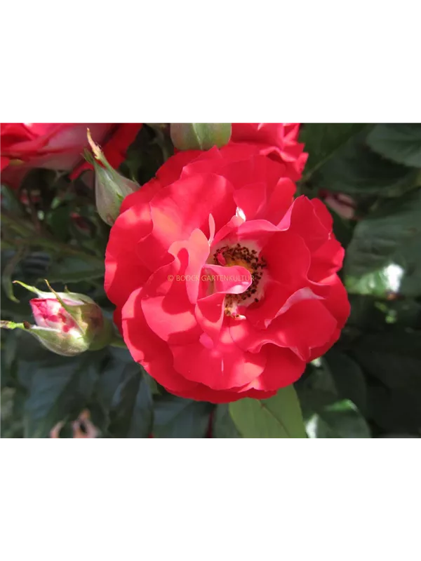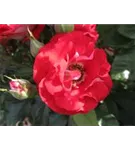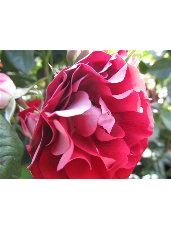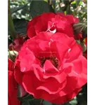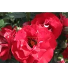 Die rot-weißen, gefüllten, schalenförmigen Blüten der Beetrose 'Rose der Einheit'® erscheinen in Dolden von Juni bis September. Diese werden etwa 5 - 6 cm groß.