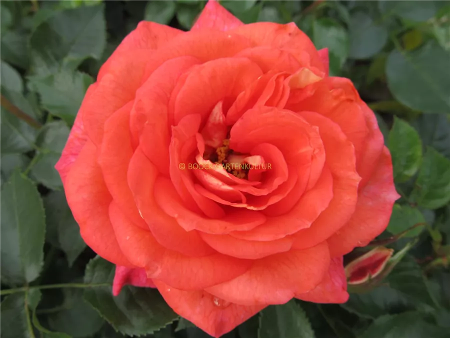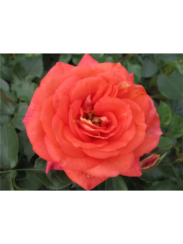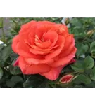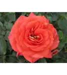 Die lachsorangenen, starkgefüllten, schalenförmigen Blüten der Beetrose 'Sommersonne'® erscheinen in Dolden von Juni bis September. Diese werden etwa 7 - 8 cm groß und sind leicht duftend.