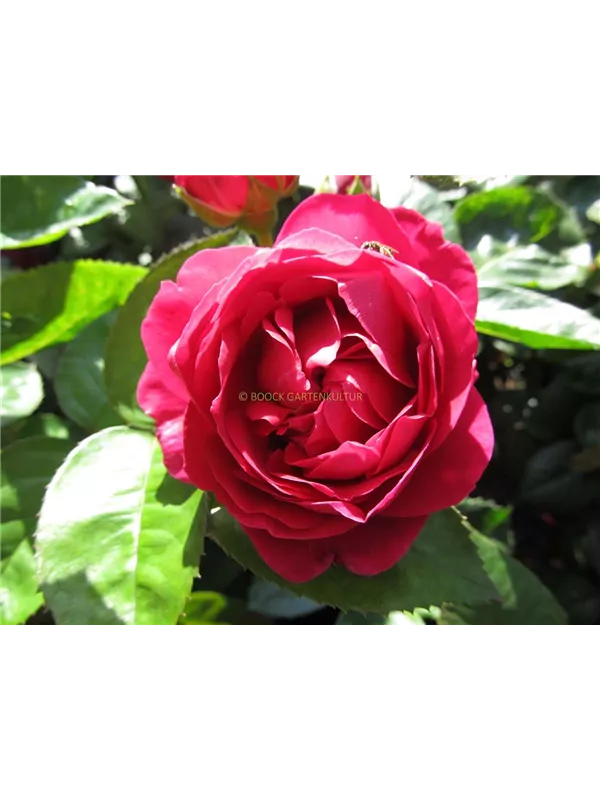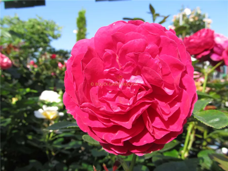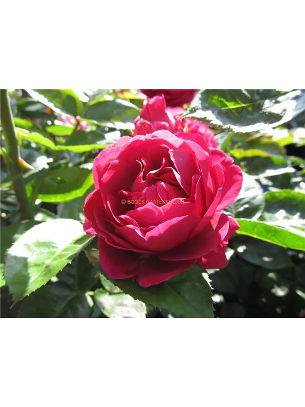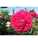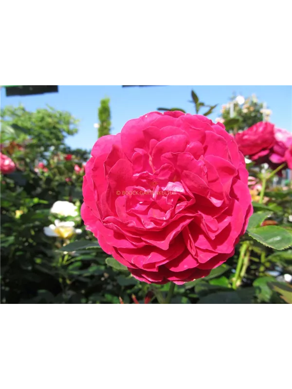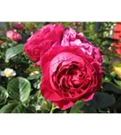 Die purpurroten, schalenförmigen Blüten sind starkgefüllt und erscheinen von Juni bis Oktober. Diese sind leicht duftend.