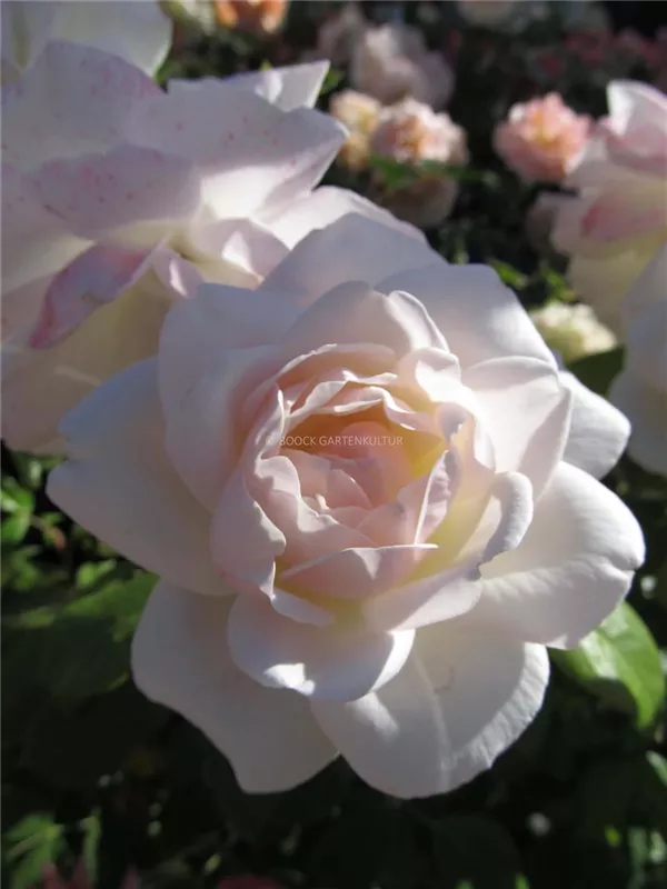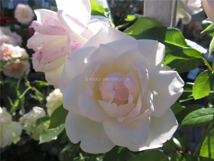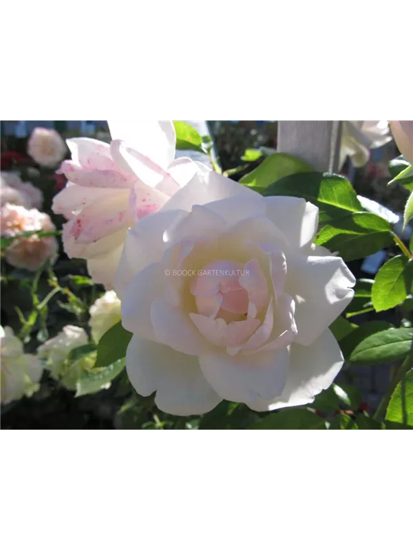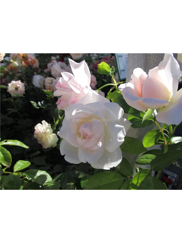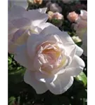 Die weißen, schalenförmigen Blüten der Beetrose 'Helga'® erscheinen in Dolden von Juni bis September.