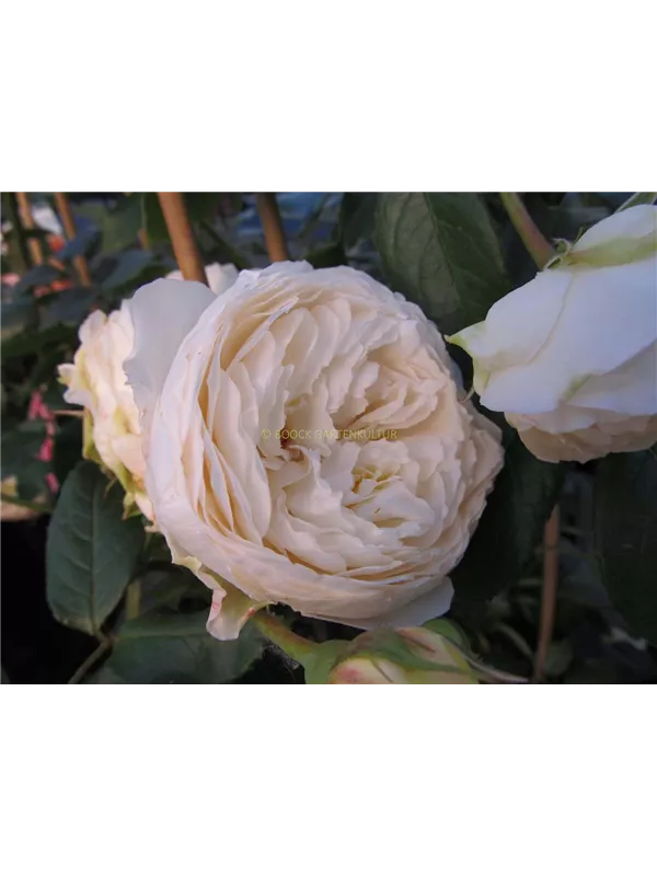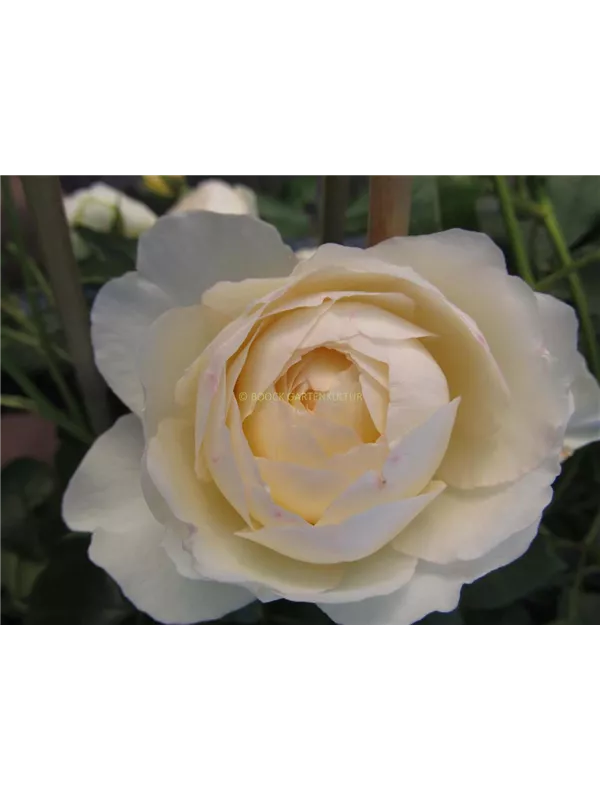 Die cremeweißen, schalenförmigen Blüten sind gefüllt und erscheinen von Juni bis Oktober. Diese sind stark duftend.