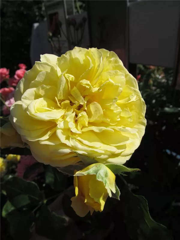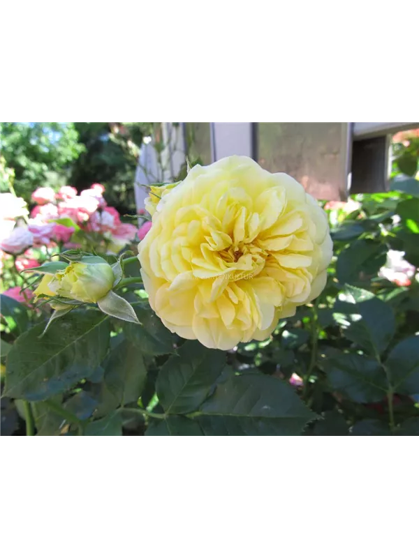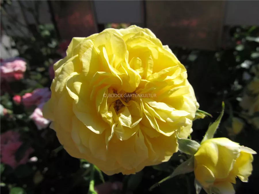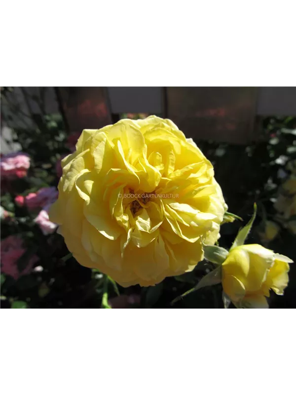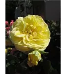 Die gelben, starkgefüllten, schalenförmigen Blüten der Beetrose 'Inka' erscheinen in Dolden von Juni bis September. Diese werden etwa 6 - 8 cm groß und sind angenehm duftend.