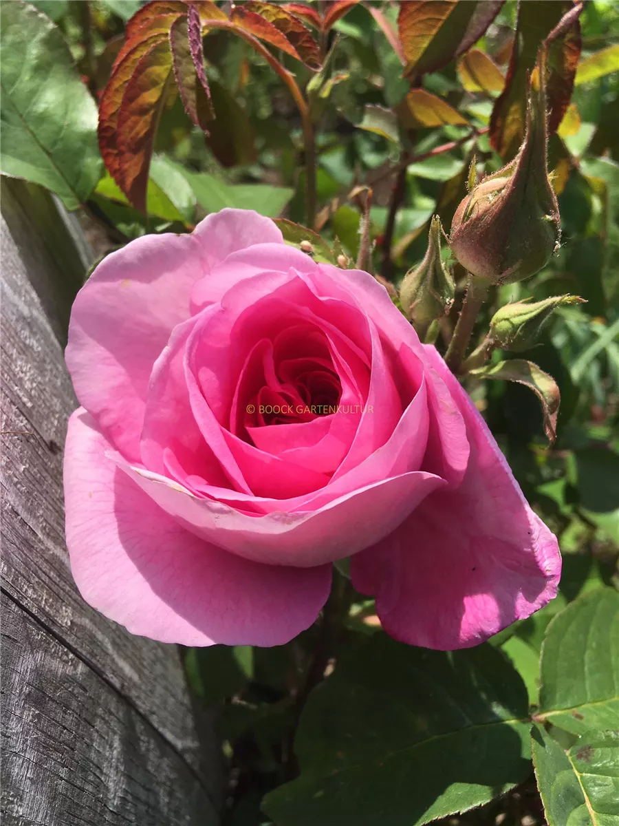 Die rosafarbenen, schalenförmigen Blüten sind starkgefüllt und erscheinen von Juni bis Oktober. Diese sind stark duftend.